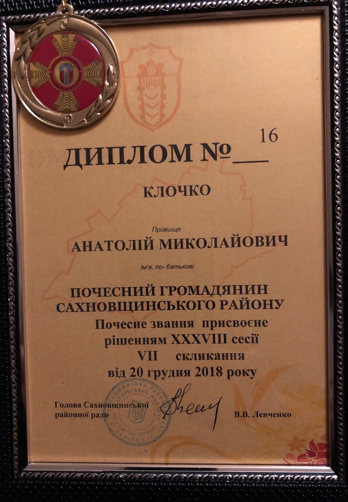 Рішенням XXXVIII сесії VII скликання Сахновщинської районної ради проректору Харківського національного університету внутрішніх справ доктору юридичних наук, академіку Міжнародної Кадрової Академії, академіку Інженерної академії України, першому заступнику Голови Харківської обласної організації Союзу юристів України Анатолію Клочку присвоєно звання «Почесний громадянин Сахновщинського району».