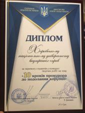 Відбувся другий щорічний конкурс, організаторами якого виступили Генеральна прокуратура України та Міністерство освіти і науки України. Тема конкурсу «10 кроків прокурора до подолання корупції». Захід проводився серед студентів усіх вищих навчальних закладів, які навчаються за спеціальністю «Право». Мета проведення конкурсу – надати можливість студентській та курсантській молоді проявити себе та свої здібності.