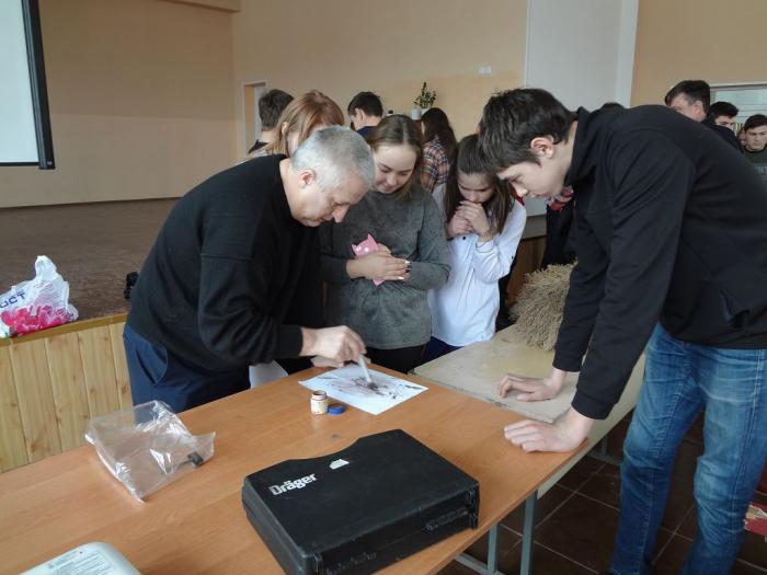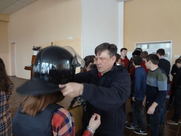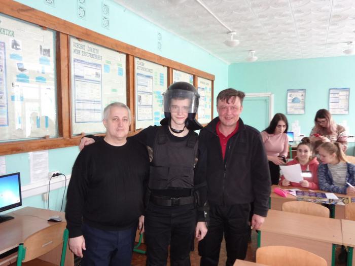 Викладачі Інституту післядипломної освіти Сергій Захарченко, Ярослав Бондаренко, Олександр Мірошко продемонстрували учням прийоми фіксації дактилоскопічних слідів та перевірки водіїв на вміст алкоголю за допомогою газоаналізатора алкотестера «Драгер». Також старшокласники отримали можливість на мить відчути себе поліцейськими, приміряючи різні засоби індивідуального захисту – комплекти для захисту рук та ніг, шолом, маскувальний халат, бронежилет тощо.