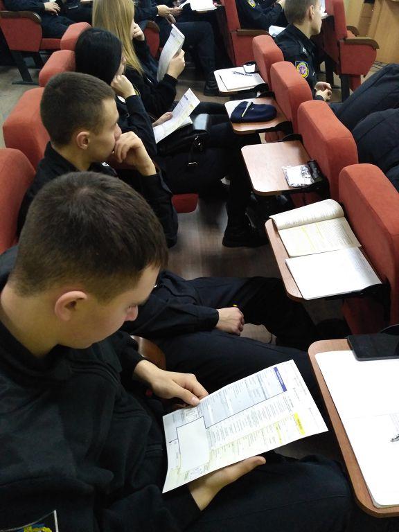 Під час заняття курсантам роздали пам’ятки із надання окремих видів страхових послуг, а також розглянули питання особистого страхування працівників Національної поліції України.