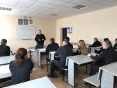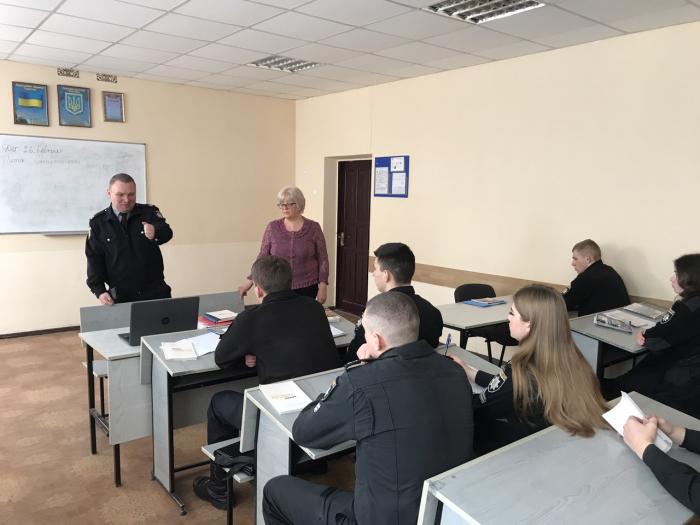 Старший викладач кафедри іноземних мов факультету № 1 Галина Сорокіна провела бінарне заняття з німецької мови з курсантами ІІ курсу за темою «Патрулювання». Старший інспектор сектору моніторингу Московського ВП ГУНП в Харківській області майор поліції Олег Назаров розповів про основні завдання поліції та про особливості несення служби представниками патрульної поліції. Курсантам також продемонстрували відеофільм про роботу патрульних поліцейських у Німеччині.
