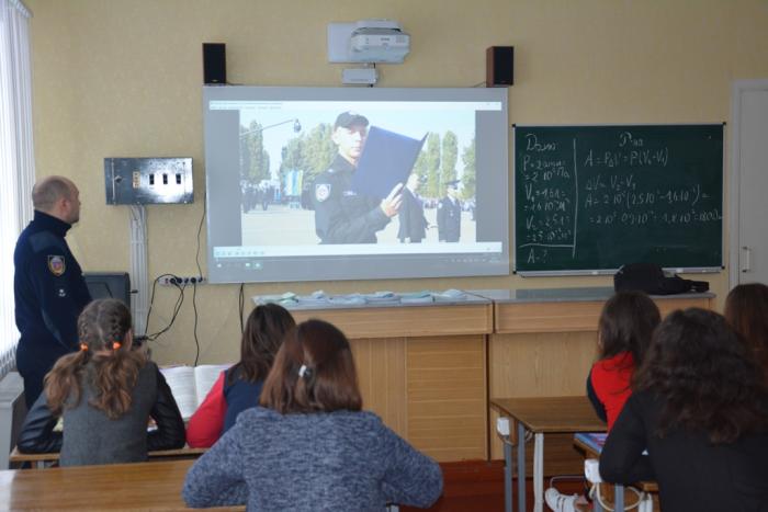 Працівники центру розповіли старшокласниками про професію поліцейського, про умови вступу та навчання у Сумській філії ХНУВС. Детально працівники центру зупинилися на правилах реєстрації та оформлення документів для вступу до закладу вищої освіти.