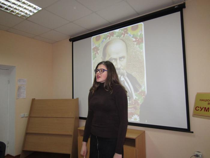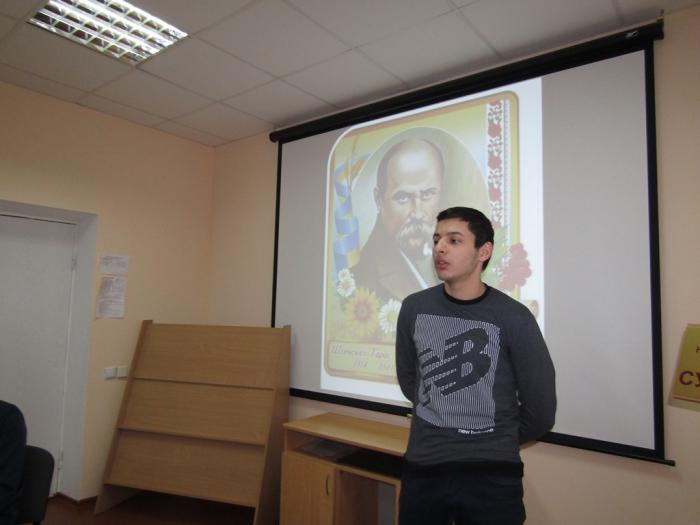 У конкурс взяли участь: студентка 3 курсу Катерина Балан ( «Реве та стогне Дніпр широкий»), студентка 2 курсу Анастасія Солоха («І мертвим, і живим, і ненародженим…»), студенти 1 курсу Ельвін Джамалов («Думка»), Вероніка Нагорна ( «Лілея»), Дмитро Деулін ( «Мені однаково»). Наприкінці конкурсу професор кафедри гуманітарних дисциплін Валентина Василенко, учасники конкурсу та студенти 1 курсу разом прочитали Шевченківський «Заповіт».
