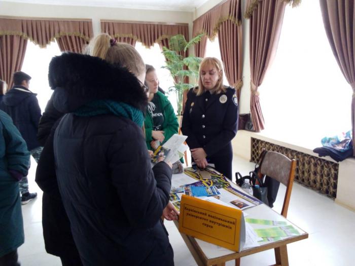 Старший викладач кафедри педагогіки та психології факультету № 3 Харківського національного університету внутрішніх справ майор поліції Олена Макарова взяла участь у ярмарку вакансій, яку проводив Харківський обласний центр зайнятості в м. Великий Бурлук. Вона поінформувала учнів 10–11 класів Великобурлуцького району щодо умов вступу та навчання у закладах вищої освіти зі специфічними умовами навчання, надала агітаційні матеріали. Питання, які найчастіше виникали у школярів, стосувалися звернення до рекрутингового центру, реєстрації та подачі online-заяви, предметів, з яких необхідно здавати ЗНО тощо.