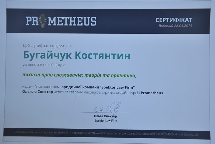 Начальник науково-дослідної лабораторії з проблем протидії злочинності Костянтин Бугайчук закінчив навчання у першому юридичному вітчизняному відкритому курсі «Захист прав споживачів: теорія та практика» із результатом 100 %, отримавши відповідний сертифікат.