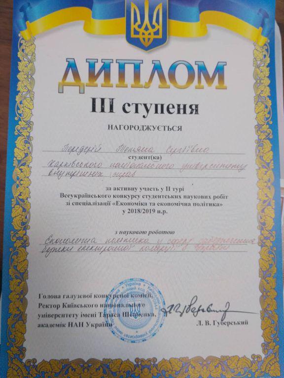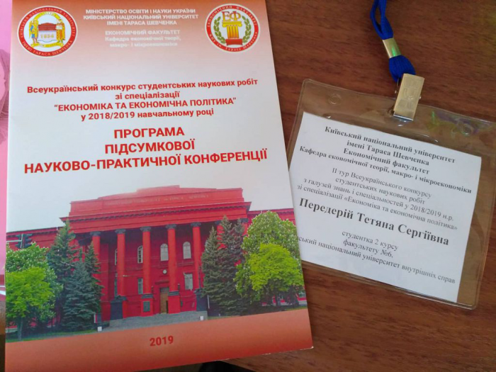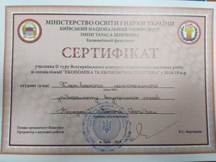 Студентка факультету № 6 Харківського національного університету внутрішніх справ Тетяна Передерій, що навчається за освітньою програмою «Фінанси, банківська справа та страхування» (фінансова безпека та фінансові розслідування), стала призером заключного етапу ІІ туру Всеукраїнського конкурсу студентських наукових робіт зі спеціалізації «Економіка та економічна політика» та отримала Диплом ІІІ ступеня.