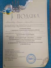 Під керівництвом завідувача кафедри економіки та фінансів Оксани Маковоз студентка підготувала наукову роботу на тему «Економічна політика у сфері забезпечення безпеки електронної комерції». Під час заключної науково-практичної конференції з доповідями виступили 27 студентів, які представляли 21 заклад вищої освіти України. В роботі галузевої конкурсної комісії взяли участь 22 провідних науково-педагогічних працівника з 11 закладів вищої освіти України.