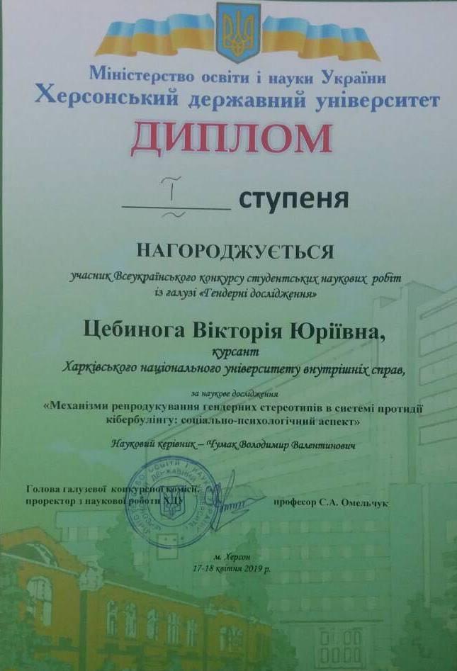 Свою наукову роботу – «Механізми репродукування гендерних стереотипів у системі протидії кібербулінгу: соціально-психологічний аспект» – курсант ХНУВС Вікторія Цебинога захищала у секції «Новітні гендерні ролі та стереотипи», яку представляли доцент кафедри журналістики Чорноморського Національного університету ім. П.М. Могили, заслужений журналіст України головний редактор газети «Акценти» Сергій Осолодкін, завідувач кафедри соціальної роботи, соціальної педагогіки та соціології Херсонського державного університету, кандидат педагогічних наук, доцент Тетяна Коршун.