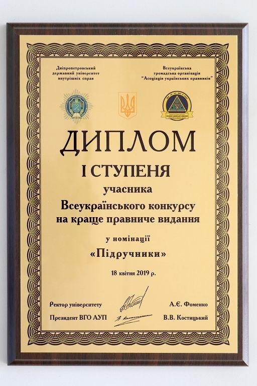 Дипломом ІІ ступеня у номінації «Підручники» відзначено Академічний курс «Кримінологія», підготовленого колективом авторів за загальною редакцією О.М. Литвинова. Диплом отримала Гладкова Євгенія Олексіївна – старший науковий співробітник науково-дослідної лабораторії з проблем протидії злочинності.