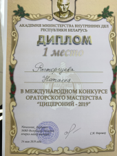 У Мінську (Республіка Білорусь) відбувся ХІХ Міжнародний конкурс ораторського мистецтва «Ціцероній–2019». У ньому взяли участь 45 учасників з десяти країн, серед яких і курсант 2 курсу факультету № 1 Харківського національного університету внутрішніх справ Наталія Расторгуєва. Під час конкурсу вона виступила з доповіддю «Спорт як реабілітація душі й тіла» та здобула І місце. Науковий керівник – професор кафедри теорії та історії держави і права, кандидат юридичних наук, доцент Юлія Загуменна.