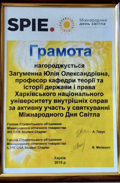 Професор кафедри теорії та історії держави і права факультету № 1 Юлія Загуменна разом з учнями Харківської спеціалізованої школи І–ІІІ ступенів № 119 взяла участь у науково-популяних заходах з нагоди Міжнародного Дня світла, які проходили у Фізико-технічному інституті низьких температур імені Б.І. Вєркіна НАН України.
