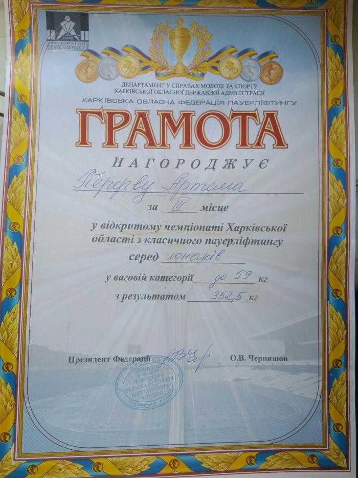 У Харкові пройшов відкритий чемпіонат Харківської області з пауерліфтингу. У ваговій категорії 59 кг член збірної команди Харківського національного університету внутрішніх справ курсант І курсу факультету № 1 Артем Перерва посів ІІІ місце з результатом 352,5 кг загальної піднятої ваги у трьох вправах зі штангою.