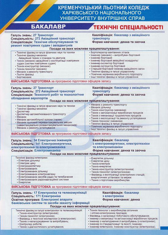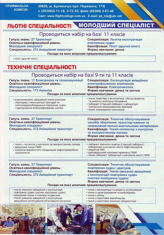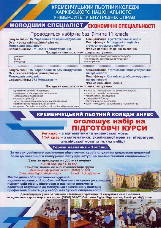 Кременчуцький льотний коледж Харківського національного університету внутрішніх справ оголошує набір з 01.07.2019 р. випускників 9-х класів та з 10.07.2019 року випускників 11-х класів на льотно-технічні та економічні спеціальності з повним державним забезпеченням. Підготовка студентів за льотно-технічними та економічними спеціальностями буде здійснюватися на сучасному обладнанні та авіаційній техніці компанії Airbus Helicopters Н-125, Н-145 та Н-225.