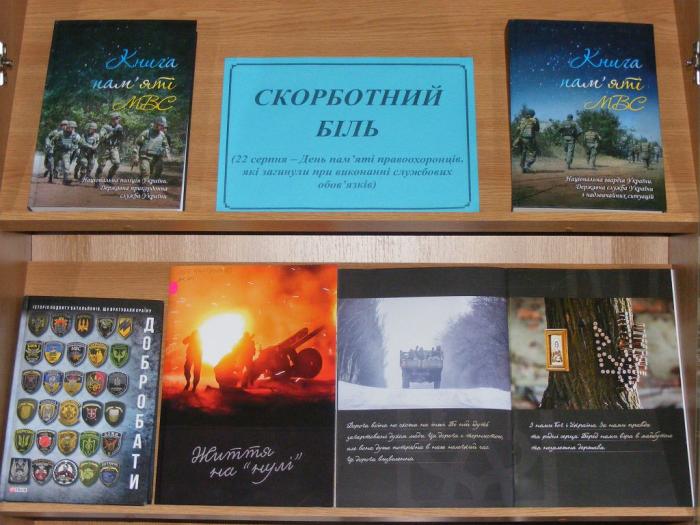 До 22 серпня – Всеукраїнського Дня вшанування пам’яті правоохоронців, які загинули при виконанні службових обов’язків, бібліотека пропонує університетській спільноті книжково-ілюстративну експозицію «Скорботний біль».