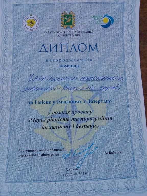 На базі Військового інституту танкових військ НТУ «ХПІ» у рамках проекту «Через рівність та порозуміння до захисту і безпеки» відбулися змагання з лазертагу серед закладів вищої освіти сектору безпеки та оборони регіону. Збірна команда Харківського національного університету внутрішніх справ у складі якої – курсанти 2 курсу факультету № 4 Володимир Нирко, Ілля Андреєв, Нікіта Ворожко, курсант 2 курсу факультету № 3 Ангеліна Герасимович, курсант 1 курсу факультету № 4 Марія Баннікова та курсант 2 курсу факультету № 1 Аліса Сіліна – посіла перше місце.