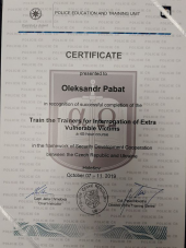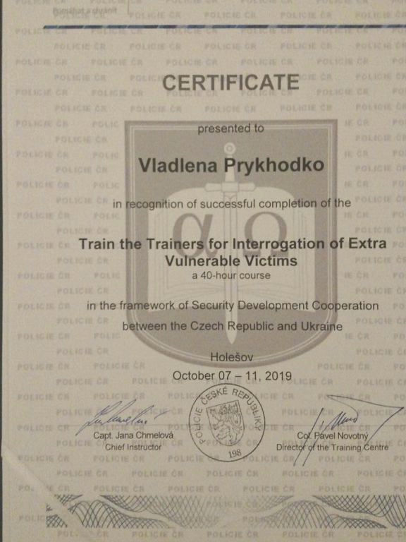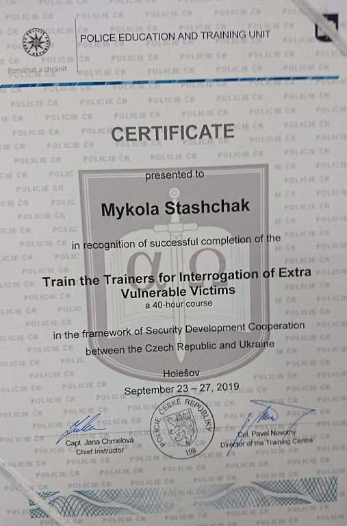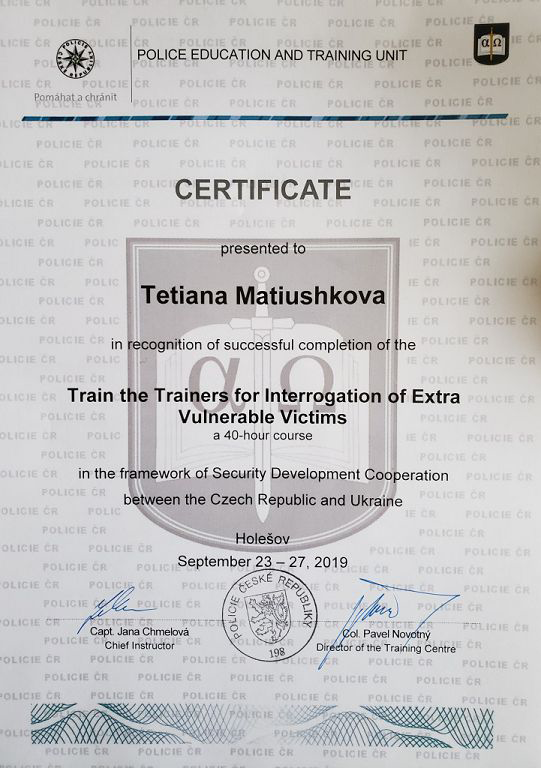На базі поліцейського тренінгового центру міста Голєшов (Чеська республіка) Управлінням професійної підготовки і освіти поліції Чеської республіки було проведено тренінг на тему «Методологія допиту потерпілих, що знаходяться у надзвичайно вразливому стані». У тренінгу взяли участь працівники апарату МВС України та закладів вищої освіти МВС України. Харківський національний університет внутрішніх справ представили професор кафедри оперативно-розшукової діяльності та розкриття злочинів факультету № 2 майор поліції Микола Стащак, доцент кафедри криміналістики та судової експертології факультету № 1 підполковник поліції Тетяна Матюшкова, доцент кафедри адміністративного права і процесу факультету № 1 підполковник поліції Олександр Пабат, викладач кафедри криміналістики та судової експертології факультету № 1 майор поліції Владлена Приходько.