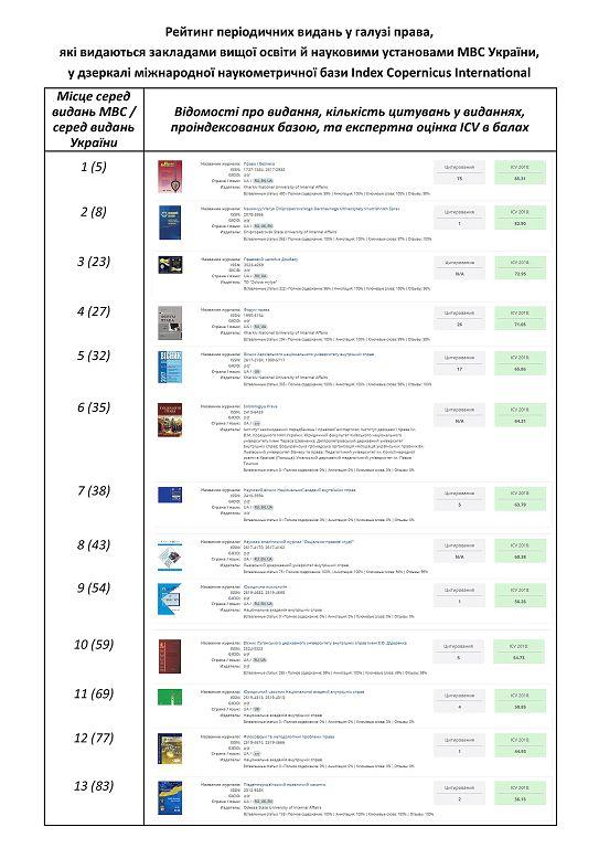 Зауважимо, що станом на 19.10.2019 серед видань у галузі права журнал посідає 5-те місце в рейтингу національних видань з-поміж 88-ми, які залишилися в базі після запровадження нею підвищених експертних вимог. У світовому рейтингу це 48-ма позиція з 248-ми, а серед юридичних видань закладів вищої освіти й наукових установ МВС України журнал є першим!