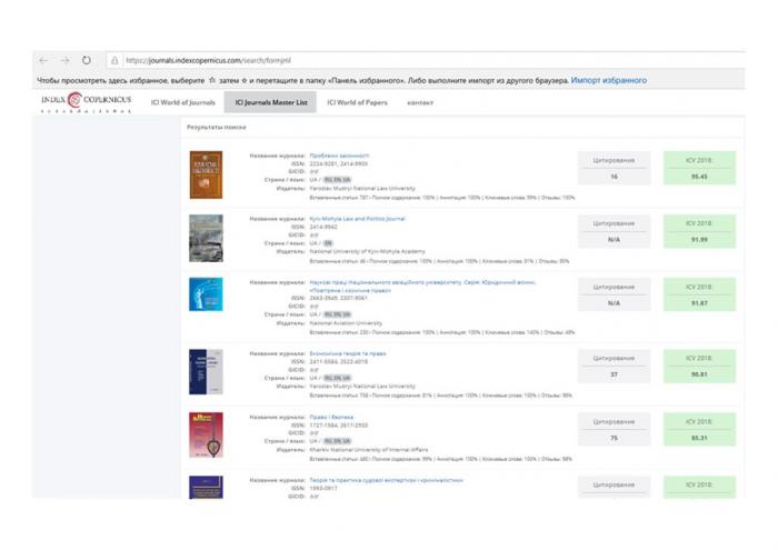Незалежними експертами за методологією, представленою на сайті бази, найбільший приріст у якості у вигляді ICV(IndexCopernicusValue) було відзначено в журналі «Право і безпека» (+22,47 бала), за ним ідуть видання «Форум права» (+20,74 бала) та «Вісник ХНУВС» (+8,57 бала).