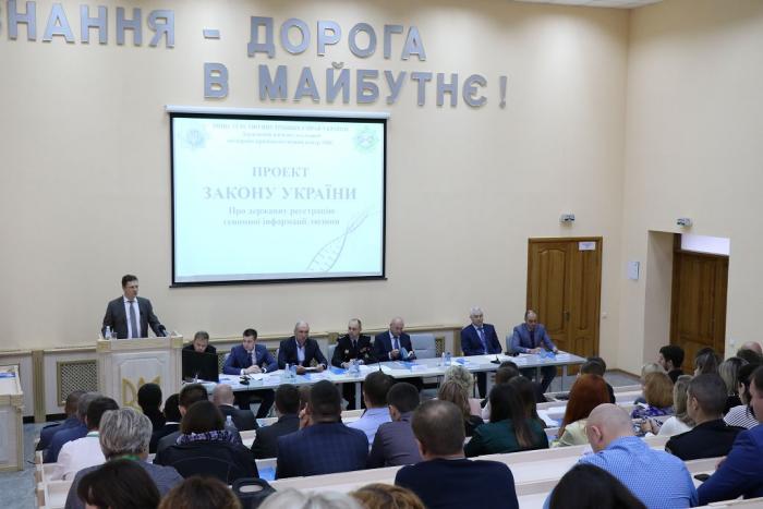 Заступник директора ДНДЕКЦ МВС – заступник керівника Експертної служби МВС Костянтин Дубонос представив присутнім проект Закону України «Про державну реєстрацію геномної інформації людини» та ознайомив з його основними засадами. Як зазначив Костянтин Валентинович, за останній час кількість об"єктів молекулярно-генетичної експертизи збільшилася на 40%, що змушує удосконалювати діяльність експертних служб, збільшувати кількість науково-дослідних лабораторій, впроваджувати в роботу нові розробки та технології. Зокрема, законом пропонується впровадження державної реєстрації геномної інформації людини, створення відповідної бази даних, що сприятиме пошуку зниклих осіб, ідентифікації загиблих під час бойових дій тощо.