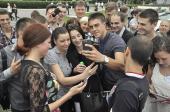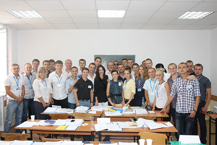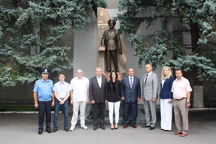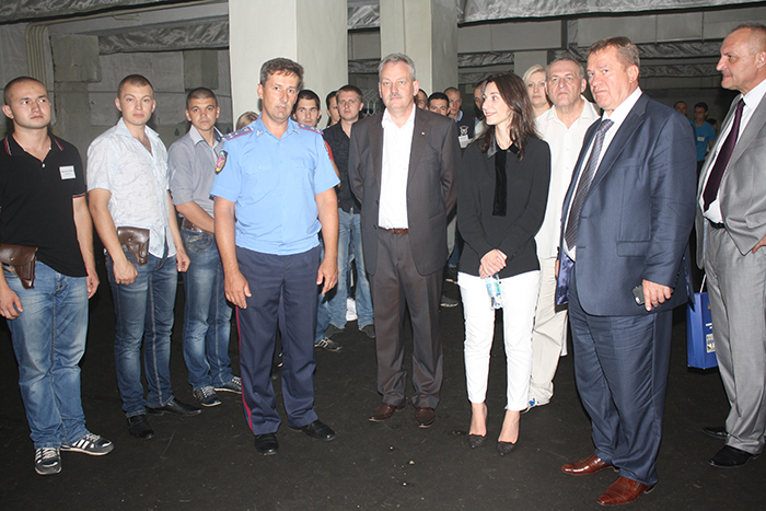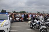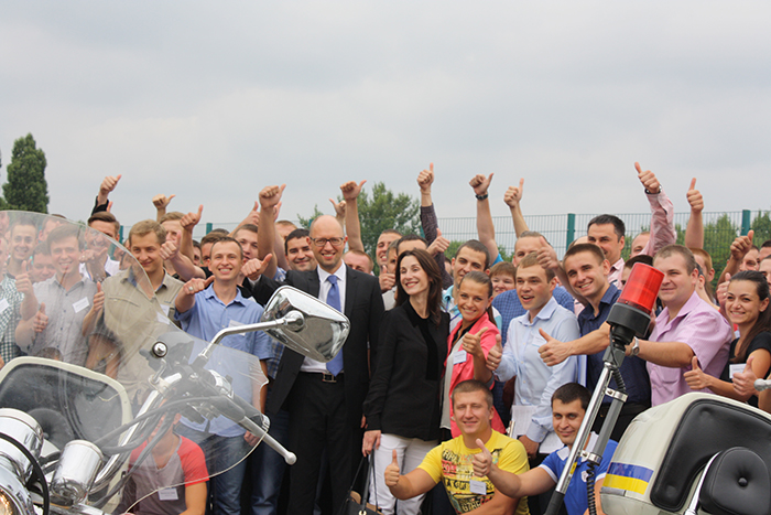 Прем’єр-міністр України Арсеній Яценюк, Міністр внутрішніх справ України Арсен Аваков та перший заступник Міністра внутрішніх справ України Ека Згуладзе сфотографувалися зі слухачами курсів професійної підготовки працівників нової патрульної служби у Харківському національному університеті внутрішніх справ.