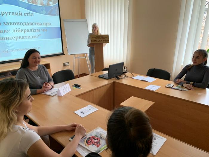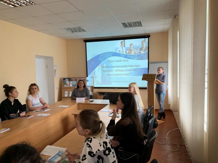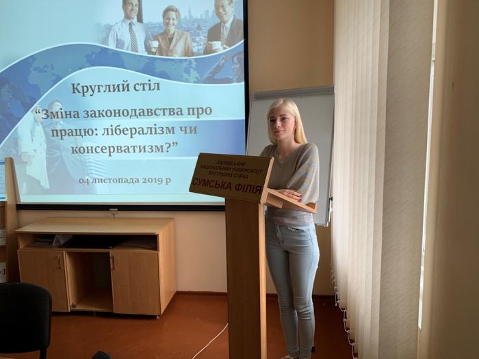 У Сумській філії Харківського національного університету внутрішніх справ відбувся круглий стіл «Зміна законодавства про працю: лібералізм чи консерватизм?», який був організований завідувачем кафедри юридичних дисциплін Оксаною Панасюк, доцентом цієї ж кафедри Наталією Дуравкіною та студентами – членами наукового студентського гуртка «Трудового, аграрного, земельного адміністративного, господарського та фінансового права».
