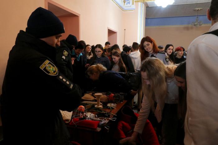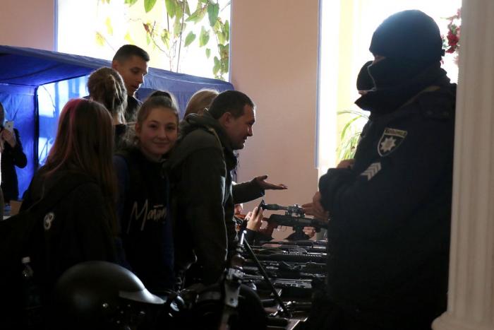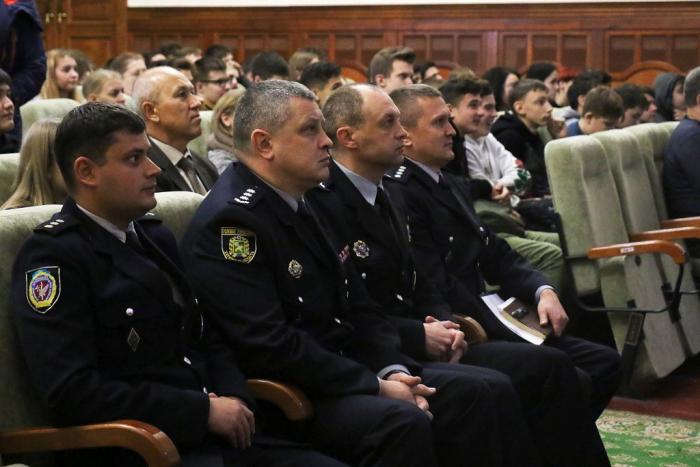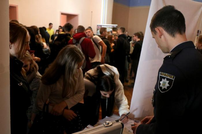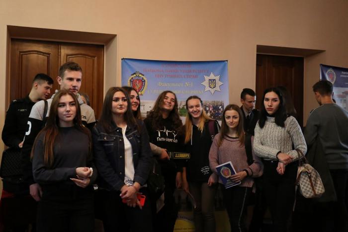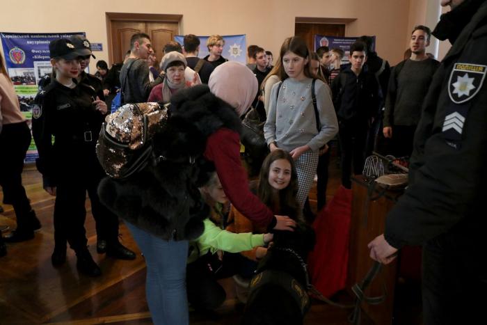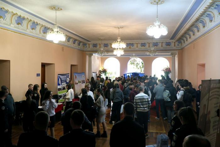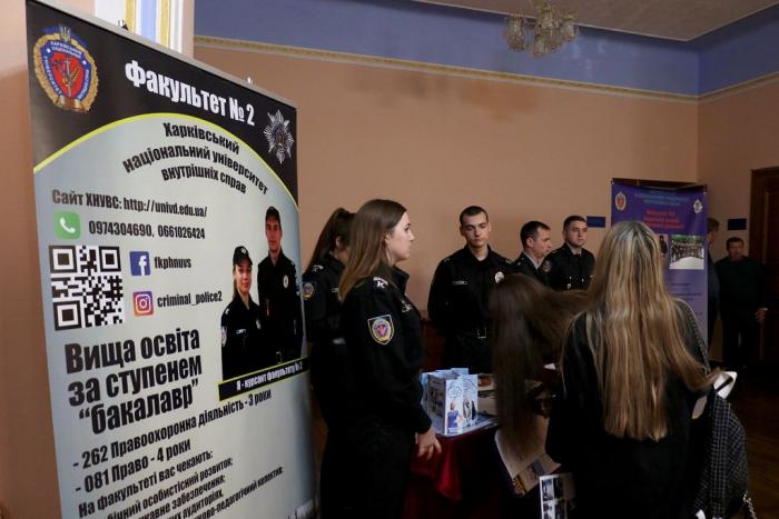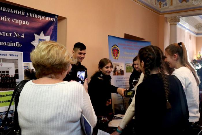 Знайомство з університетом та роботою в поліції розпочалося ще у фойє Будинку культури поліції, де факультети університету презентували спеціальності та спеціалізації, за якими готують фахівців для Національної поліції. Працівники та курсанти факультетів розповіли школярам про переваги професії правоохоронця, пояснили особливості оформлення особових справ та подання документів для вступу до вишу, про умови навчання та проживання в університеті. Вони поінформували молодь про можливість навчатися на кафедрі військової підготовки університету та отримати військову спеціальність. Також зазначили, що кандидати з числа цивільних осіб, які бажають навчатися у закладах вищої освіти зі специфічними умовами навчання, що здійснюють підготовку поліцейських за кошти державного бюджету (курсанти), повинні пройти обов’язкову електронну реєстрацію на сайті https://osvita.np.gov.ua/.