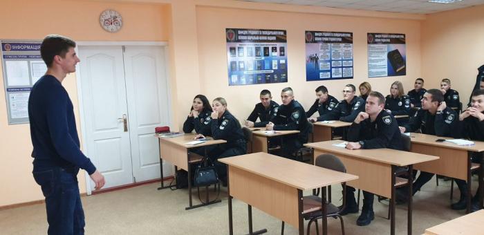 Владислав Петров розповів про особливості злочинів, що скоюються у цій сфері, про навантаження цієї лінії, про найбільш доцільні прийоми та способи, що застосовуються при розслідуванні цієї категорії злочинів чи кримінальних проваджень, про типові ознаки, притаманні цій категорій злочинів. Наприкінці заняття він відповів на численні запитання щодо практичної діяльності поліцейського.