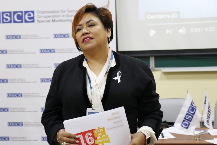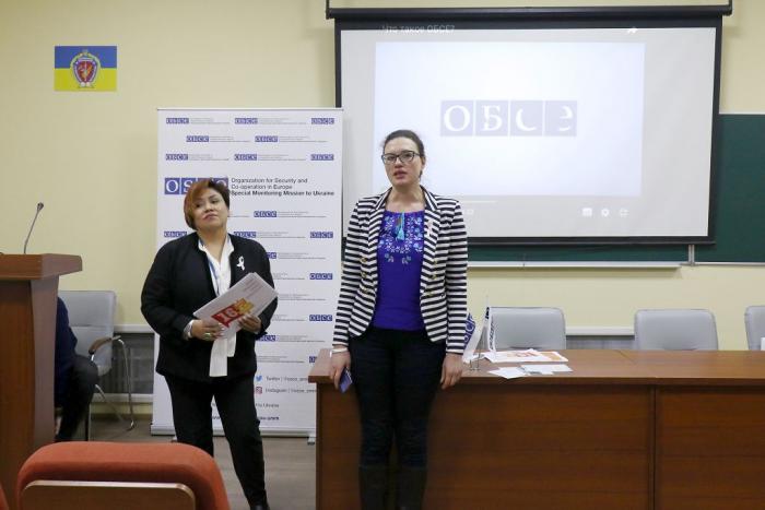 У рамках Всеукраїнської акції «16 днів проти насильства» представники Спеціальної Моніторингової Місії Організації з безпеки і співробітництва в Європі провели презентацію основних напрямів своєї діяльності. Спостерігач СММ ОБСЄ в Україні Хайді Маргарита Васкез Панес розповіла присутнім про діяльність Спеціальної Моніторингової Місії ОБСЄ в Україні, її основні завдання та специфіку. Окремо було розглянуто положення Резолюції 1325 Ради Безпеки ООН «Жінки, мир, безпека».