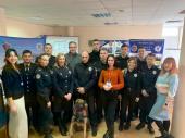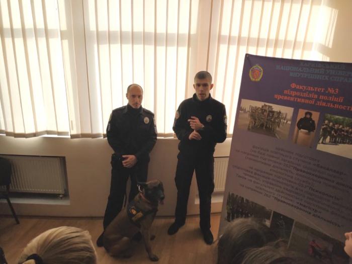 Доцент кафедри поліцейської діяльності та публічного адміністрування факультету № 3 майор поліції Вадим Селюков та старший інспектор Кінологічного центру ГУНП в Харківській області капітан поліції Сергій Іванов ознайомили учнів з професією кінолога.