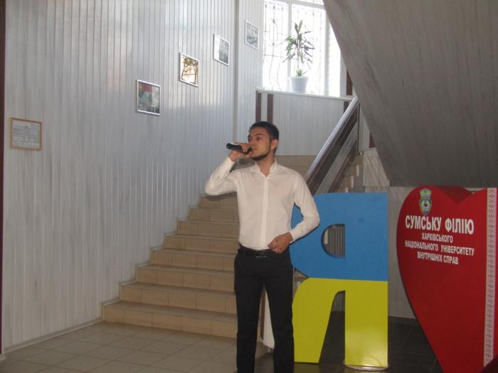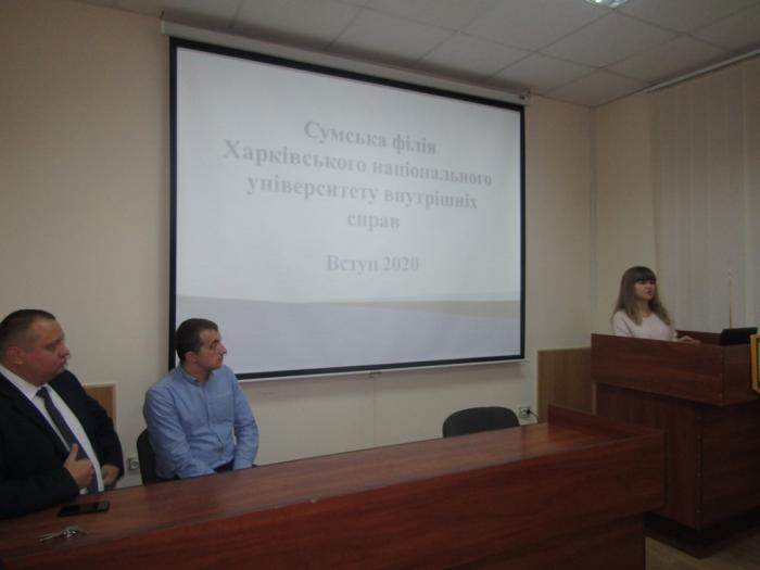 З вітальним словом до гостей заходу звернувся директор Сумської філії ХНУВС Сергій Лукаш. Він розповів про заклад освіти, про особливості вступу та навчання у філії як за державним замовленням, так і за кошти фізичних та юридичних осіб, а також побажав майбутнім абітурієнтам гарного навчання та успішного складання зовнішнього незалежного оцінювання. Начальник сектору організації відбору та проведення атестування поліцейських Управління кадрового забезпечення ГУНП в Сумській області Євген Шосталь, звертаючись до майбутніх абітурієнтів, розповів про особливості реєстрації та оформлення особових справ для навчання за спеціальністю «Правоохоронна діяльність» за державним замовленням (курсантами), про перспективи працевлаштування в органах та підрозділах поліції, про особливості проходження служби на посадах поліцейських.