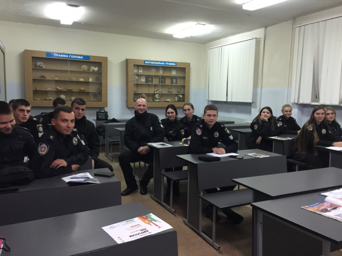 Старшим викладачем кафедри іноземних мов факультету № 1 Любов’ю Русановою та викладачем цієї ж кафедри Ганною Бабак за участі старших групи реагування поліції охорони Дмитра Галагана та Михайла Салащенка було проведено бінарне заняття з курсантами групи 301 факультету № 1 з навчальної дисципліни «Іноземна мова». Тема заняття – «В поліцейській дільниці».