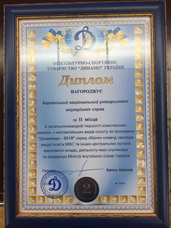 За підсумками загальнокомандної першості комплексних змагань з неолімпійських видів спорту за програмою «Динаміада–2019» серед збірних команд територіальних організацій товариства і чемпіонатів серед збірних команд закладів вищої освіти МВС та інших центральних органів виконавчої влади, діяльність яких спрямовує та координує Міністр внутрішніх справ України, Харківський національний університет внутрішніх справ посів ІІ місце.