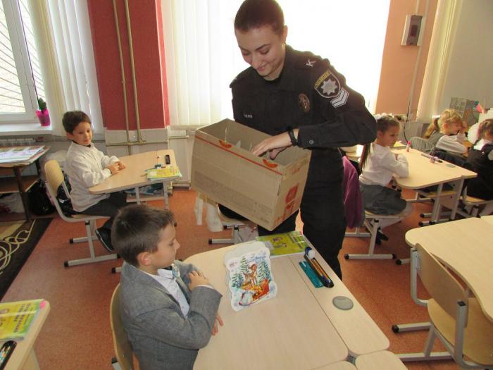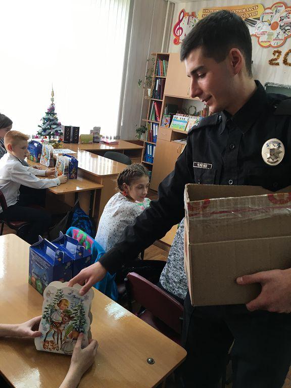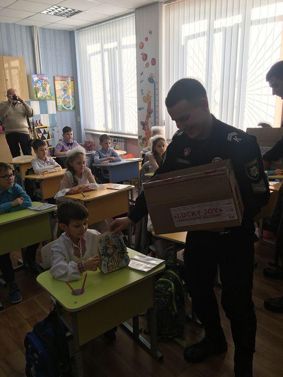 Після закінчення святкових заходів, працівники та курсанти відвідали кожний клас школи, спілкувалися зі школярами, цікавилися тим, якої допомоги потребують їх підшефні та вручили кожній дитині солодощі. Для початкових класів було організовано солодкий стіл.