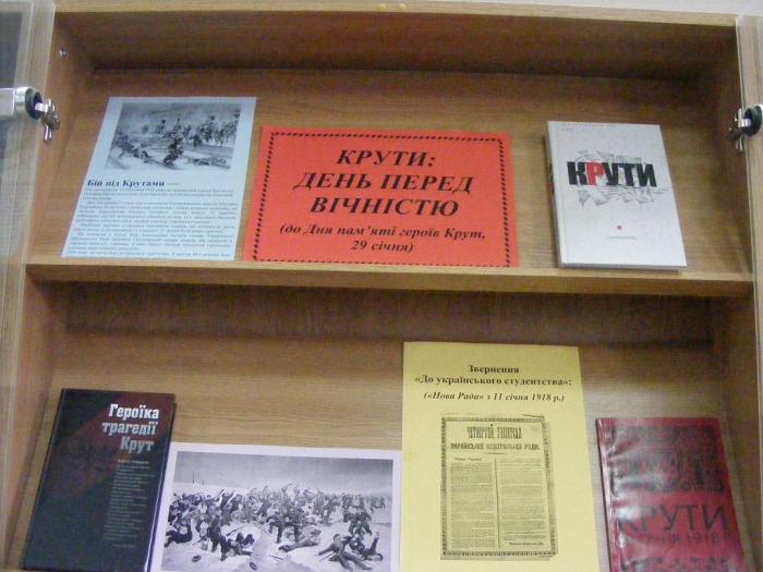 З нагоди Дня вшанування пам’яті Героїв Крут (29 січня) бібліотекою Харківського національного університету внутрішніх справ спільно з Центральною міською бібліотекою ім. В.Г. Белінського організовано та проведено урок пам’яті «Бій під Крутами: відом й невідомі сторінки» та презентовано виставку-реквієм «Крути: день перед вічністю».