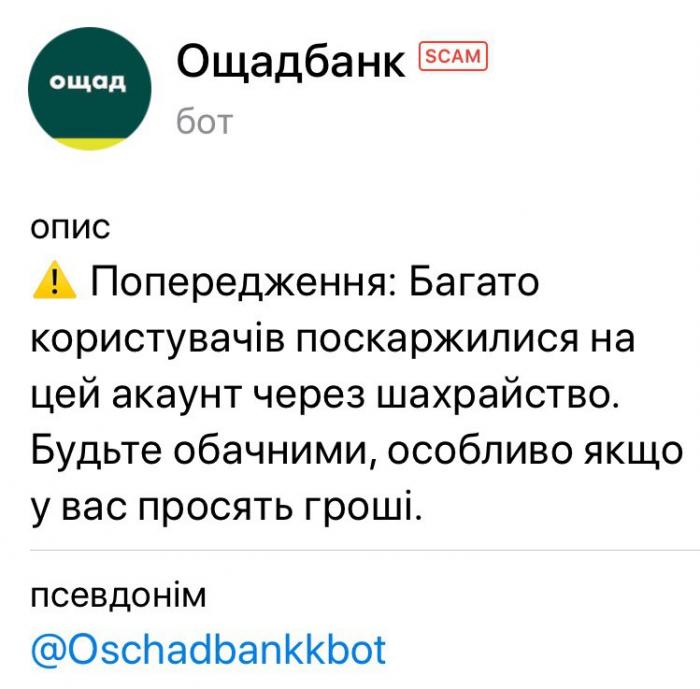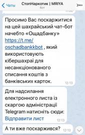 Завдяки користувачам чат-боту «СтопНаркотик» (@StopDrugBot) адміністрація месенджеру Telegram встановила позначку «Шахрайство» (Scam) та відповідне попередження Telegram-боту @OschadBankkBot, що був створений кібершахраями для незаконного отримання даних платіжних карток та подальшого заволодіння коштами клієнтів банку.