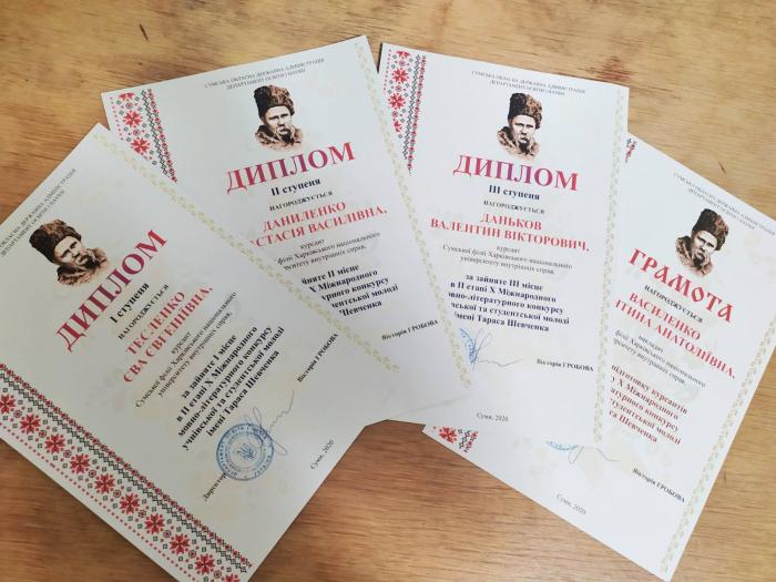 Відбувся фінальний етап Х (ювілейного) Міжнародного мовно-літературного конкурсу імені Тараса Шевченка, який зібрав представників з усіх областей України. Відбулося урочисте відкриття конкурсу та вшанування переможців регіонального етапу і їхніх наукових керівників. Серед них – курсанти Сумської філії ХНУВС Єва Тесленко, Анастасія Даниленко та Валентин Даньков.
