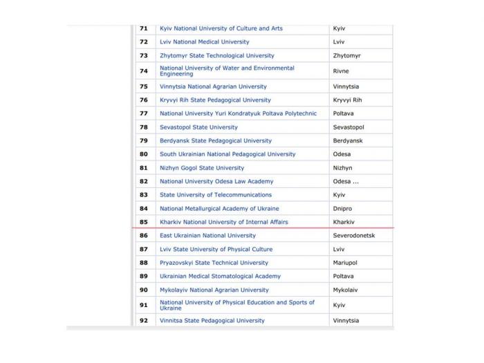 Зі 171 українського університету, які увійшли до рейтингу, ХНУВС посів 85 місце і 7192 місце з 13 600 університетів світу.