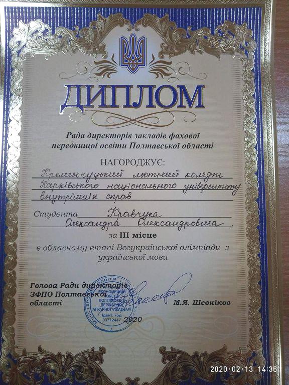 На базі Лубенського медичного коледжу Полтавської області відбувся обласний етап Х Всеукраїнської олімпіади з української мови серед студентів закладів вищої освіти, що здійснюють підготовку молодших спеціалістів. У заході взяли участь 16 студентів – переможці І етапу з 16 коледжів Полтави та області. Кременчуцький льотний коледж ХНУВС на обласній олімпіаді з української мови представляв курсант Олександр Кравчук разом з викладачем української мови та літератури Валентиною Гардаш.