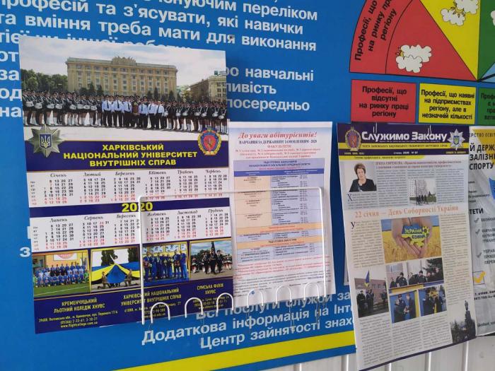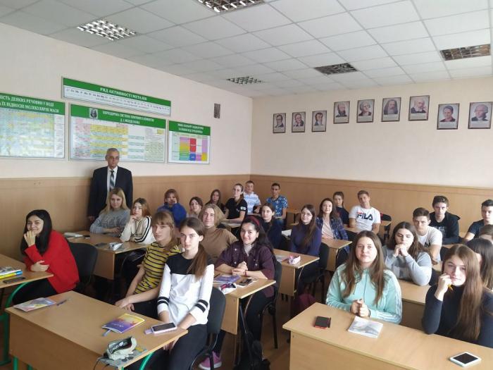 Він познайомив старшокласників з факультетами та спеціальностями, за якими здійснюється підготовка фахівців, правилами вступу до університету, розповів про переваги навчання у виші, про можливість навчатися на підготовчих курсах та закінчити військову кафедру, продемонстрував як працює експерт-криміналіст та надав інформативні матеріали про університет.