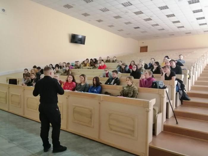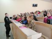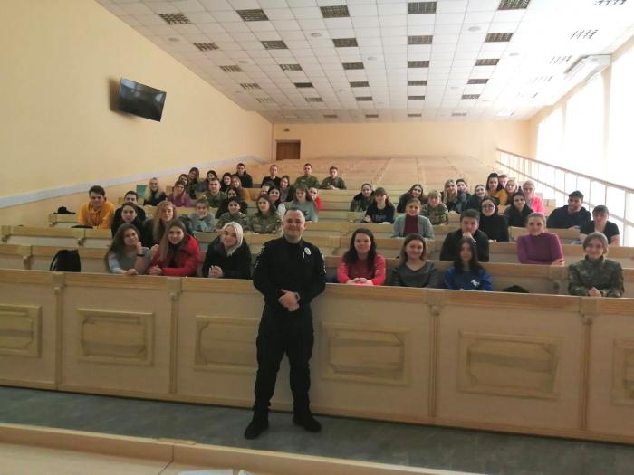 Поліцейський розповів студентам про особливості адміністративного затримання. Особливу увагу приділив відмінностям особистого та поверхневого огляду. Розглянуто було юридичні склади адміністративних правопорушень, що скоюються найчастіше.