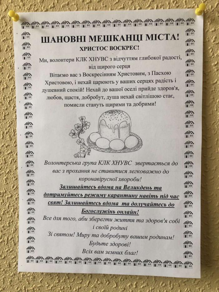 Напередодні Світлого Христового Воскресіння волонтери коледжу звернулися до мешканців міста, розмістивши інформаційні листи в районах, де знаходяться церкви, з проханням не ставитися легковажно до коронавірусної інфекції та залишатися вдома.