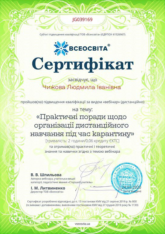 Викладач циклової комісії української та іноземної мов Кременчуцького льотного коледжу Харківського національного університету внутрішніх справ Людмила Чижова взяла участь у низці вебінарів освітнього проєкту «Всеосвіта». Серед них: «Практичні поради щодо організації дистанційного навчання під час карантину» та «Використання онлайн-тестів для організації дистанційного навчання в умовах карантину». Набутті знання викладач впроваджує у практичну діяльність в процесі викладання дисциплін онлайн.