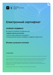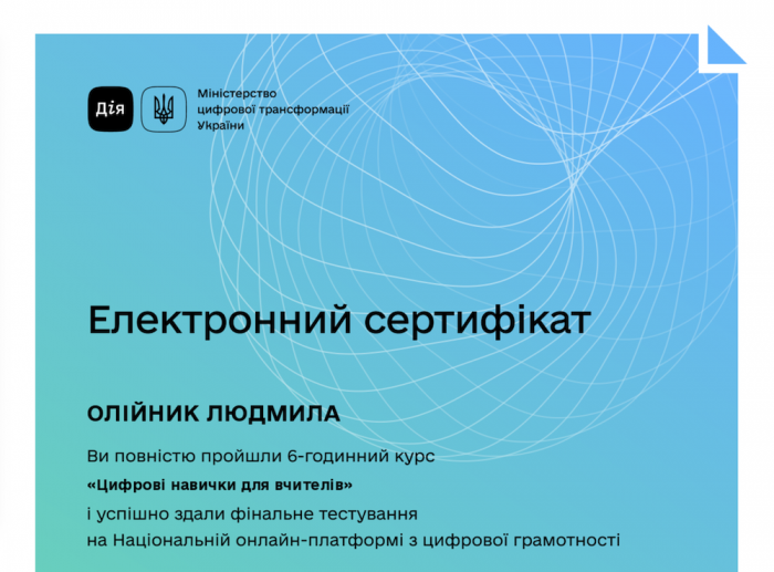 Методистка відділення авіаційного транспорту, енергетики та управління Кременчуцького льотного коледжу Харківського національного університету внутрішніх справ Людмила Олійник пройшла навчання на курсах з цифрової грамотності для вчителів на online-платформі Міністерства цифрової трансформації України.