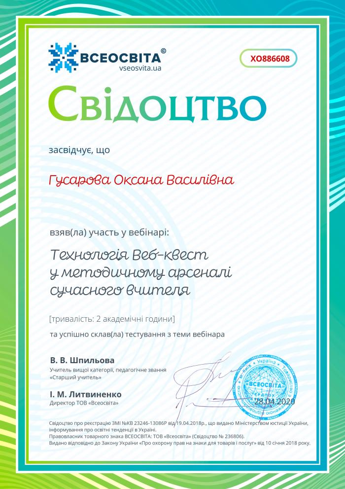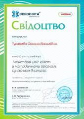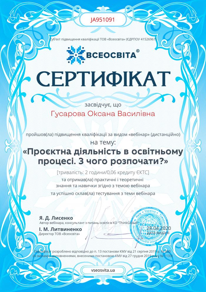 Для ознайомлення з однією з найперспективніших складових освітнього процесу – проєктною діяльністю, та таким методом навчання, як «проєкт», методикою створення та проведення веб-квестів, було пройдено вебінари на теми «Проєктна діяльність в освітньому процесі. З чого розпочати?» та вебінар «Технологія Веб-квест у методичному арсеналі сучасного вчителя». Отриманні знання викладач застосовує в практичній діяльності, для організації єдності процесу навчання між викладачем та здобувачами вищої освіти.
