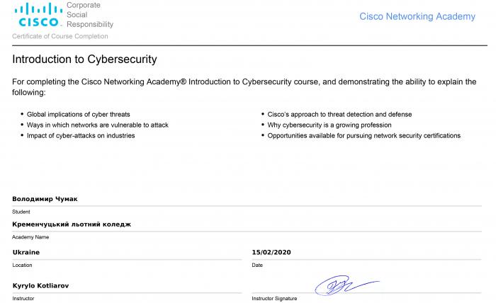 Представник Харківського національного університету внутрішніх справ т.в.о. начальника відділу організації наукової роботи доктор юридичних наук, доцент Володимир Чумак, представники Кременчуцького льотного коледжу ХНУВС – заступник директора коледжу з навчальної роботи кандидат технічних наук Юрій Шмельов, викладач циклової комісії загальнотехнічних дисциплін Андрій Сіора, керівник наукового відділу кандидат економічних наук Марина Петченко пройшли онлайн-курс «Introduction to Cybersecurity» американської транснаціональної корпорації CISCO, що організований на базі коледжу. За результатами виконаних завдань та успішно складених іспитів представники закладів отримали іменні сертифікати Мережної академії CISCO. Набуті знання та навички в процесі вивчення онлайн курсу учасники зможуть використати в своїй науковій роботі та педагогічній діяльності.