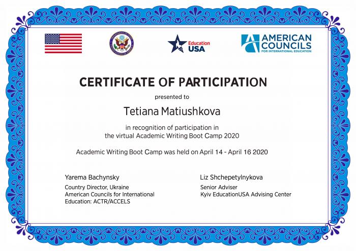 Доцент кафедри криміналістики та судової експертології Тетяна Матюшкова дистанційно пройшла 3-денний курс англійською мовою Education USA Academic Writing Boot Camp з правил написання наукових робіт до іноземних видань.