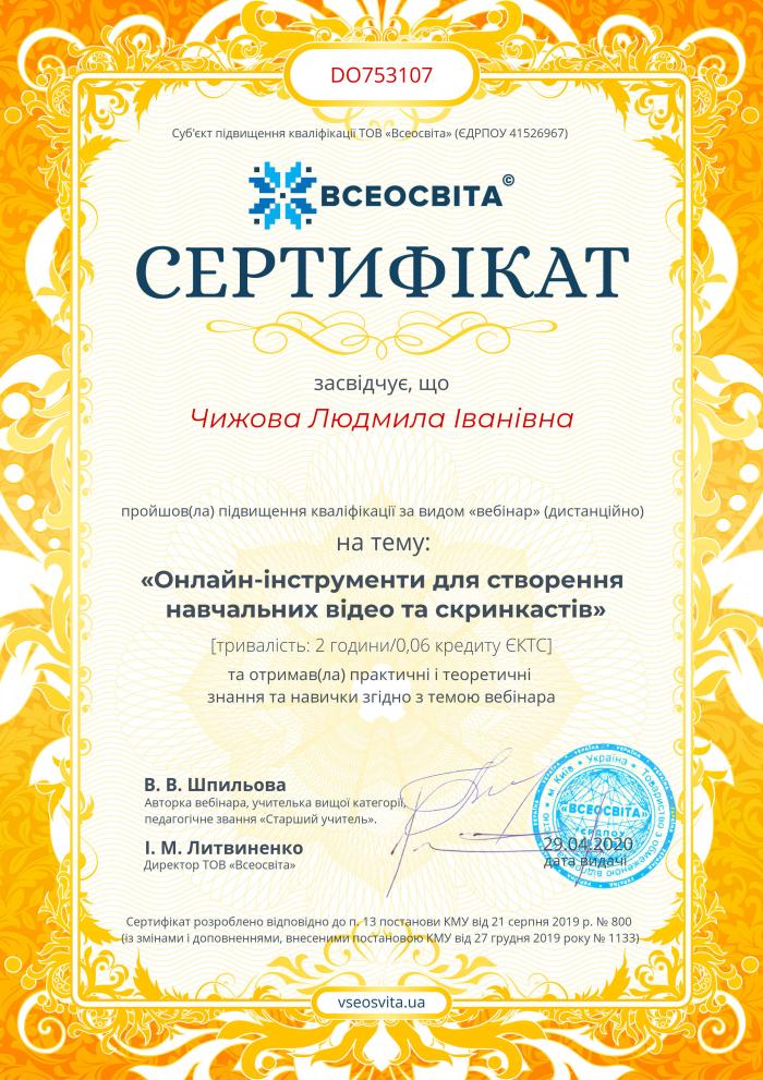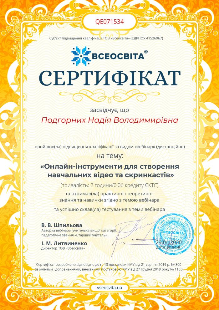 Викладач циклової комісії фізико-математичних дисциплін та інформатики Кременчуцького льотного коледжу Харківського національного університету внутрішніх справ Надія Подгорних та викладач циклової комісії української та іноземної мов Людмила Чижова взяли участь у вебінарі «Онлайн-інструменти для створення навчальних відео та скрінкастів» освітнього проєкту «Всеосвіта».