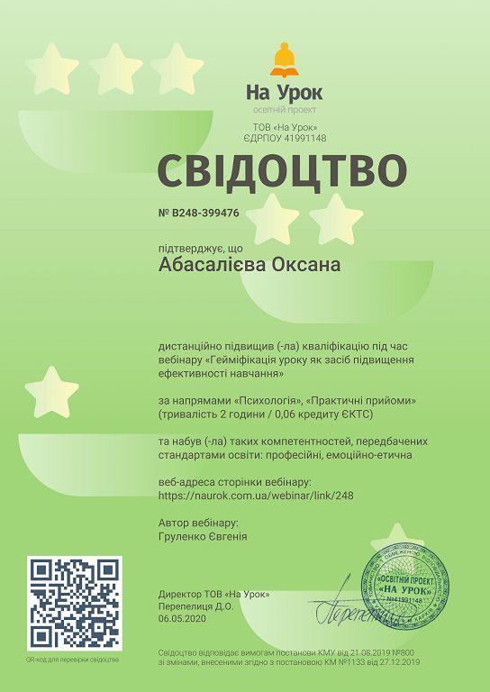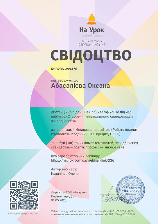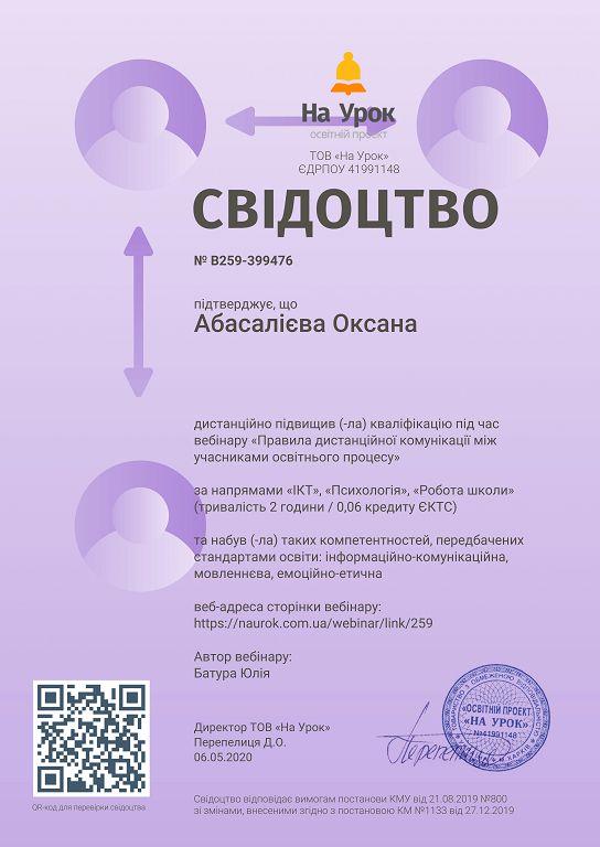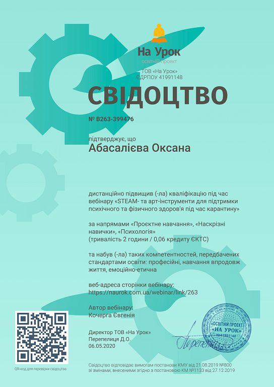 Старший викладач кафедри соціології та психології факультету № 6 Оксана Абасалієва дистанційно відвідала вебінари на платформі освітнього проекту «На Урок» за темами «Правила дистанційної комунікації між учасниками освітнього процесу», «Створення інклюзивного середовища в закладі освіти», «Гейміфікація уроку як засіб підвищення ефективності навчання», «STEAM- та арт-інструменти для підтримки психічного та фізичного здоров'я під час карантину».