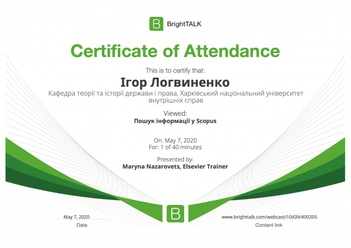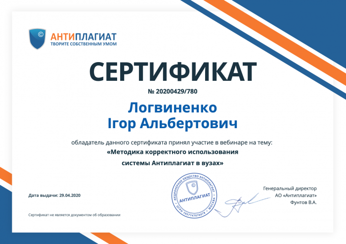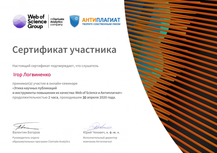 Завідувач кафедри Ігор Логвиненко дистанційно відвідав вебінари «Методика коректного використання системи Антіплагіат в закладах вищої освіти», «Етика наукових публікацій і інструменти підвищення їх якості: Web of Science и Антиплагиат», «Пошук інформації у Scopus», які були організовані за підтримки компаній «Clarivate» та «Антиплагиат». Професорка кафедри Юлія Загуменна взяла участь в оn-line панельній дискусії «Дистанційна освіта та університети». Одним із спікерів заходу виступив заступник Міністра освіти і науки України Єгор Стадний. Разом із представниками міністерства та навчальних установ обговорено актуальні питання переходу закладів вищої освіти на дистанційну форму навчання в умовах карантину.