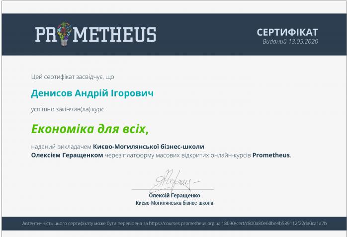 Доцент кафедри правового забезпечення факультету № 6 Харківського національного університету внутрішніх справ Андрій Денисов пройшов курси «Діалог та медіація: Шлях до порозуміння» та «Економіка для всіх» Національного університету «Києво-Могилянська Академія» через платформу масових відкритих онлайн-курсів Prometheus та отримав сертифікати.